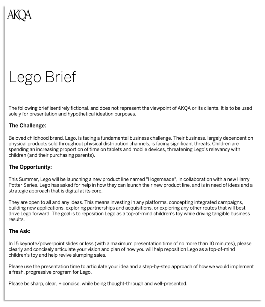 If you’ve been around advertising long enough, you’ve heard of the AKQA Lego Brief. It’s an exercise that they’ve been doing for years as part of the hiring process with Job applicants of a certain seniority. Recently I was considering moving to London to take a position as a Program Director on their Rolls Royce account and my time finally came to participate in this prestigious tradition. I was offered the job but declined it as the salary wasn’t going to work for me and I had some other opportunities that seemed like a better option.